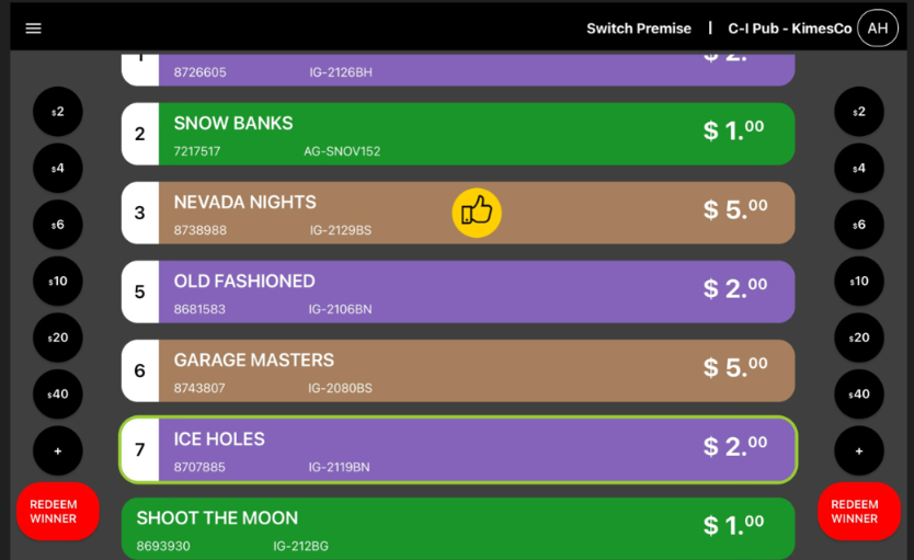 A thumb's up located in the dashboard screen. This display should only be used if your players can't see your screen. For example, a bar operation. But if your screen is in a booth or other place where the payers can't see the screen, then this option works.