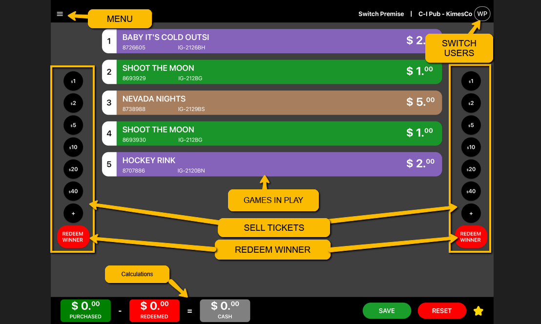 The Dashboard shows you the games in play and offers the ability to sell tickets and redeem prizes against those games.